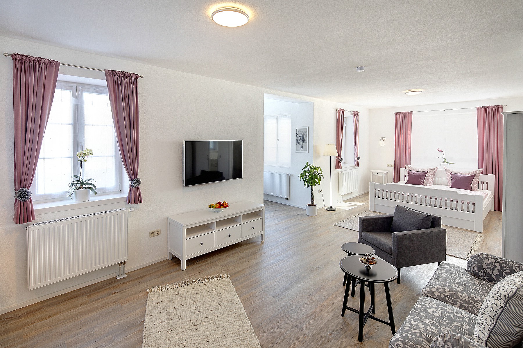 Im Wohnbereich befindet sich ein großer LED-TV und freies WLan.